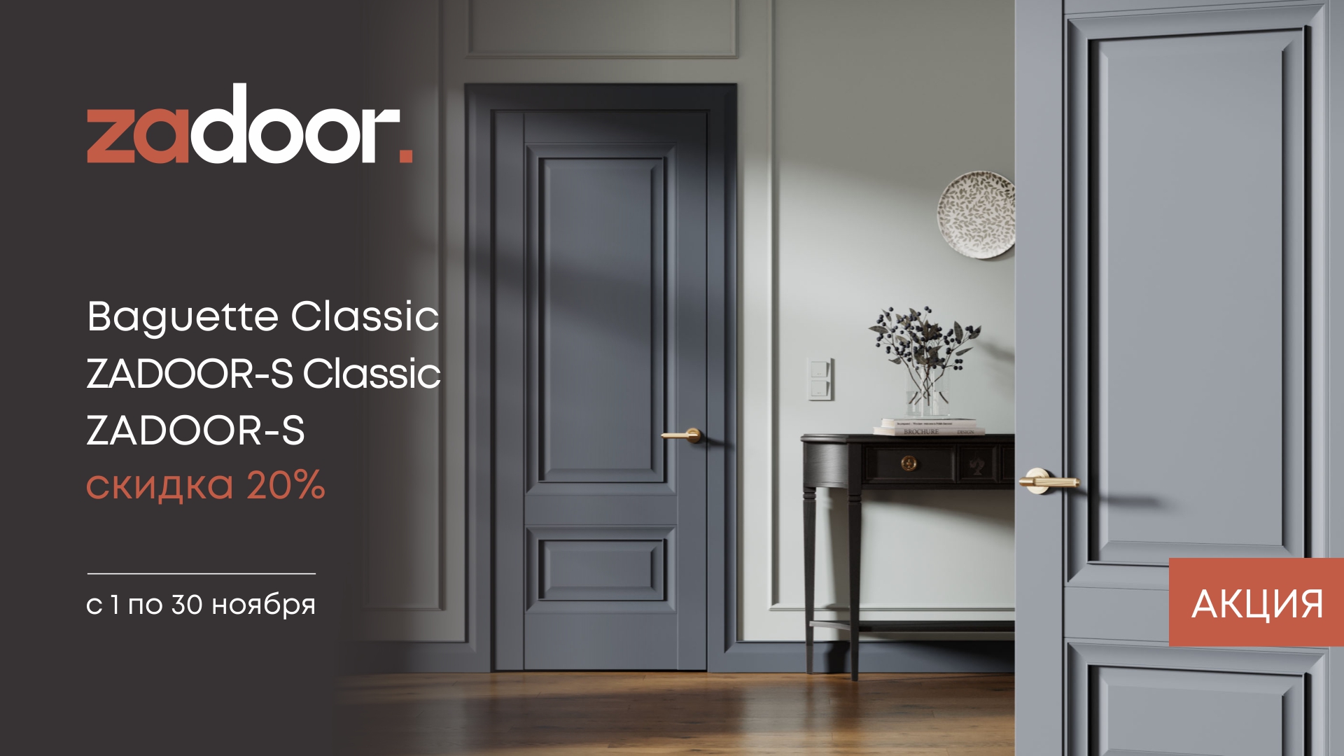 В период с 1 по 30 ноября 2025 года мы предлагаем скидку 20% на полотна и погонаж всех моделей серии Baguette Classic, Zadoor-S и Zadoor-S Classic для розничных покупателей. Более подробную информацию можно уточнить у наших менеджеров или в любом салоне ZADOOR.